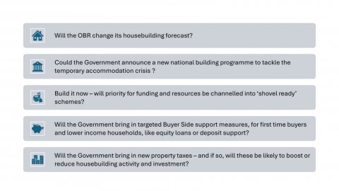 Ahead of this year's Budget, the housebuilding industry body, HBF, is reported to have made representations to the OBR in which they have warned of current market conditions and the risks for achieving higher building targets, including higher taxes and levies faced by the housing industry. A key question is whether the OBR revises its housing forecast and, if so, whether there will be any resultant impact on GDP and growth.